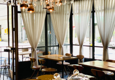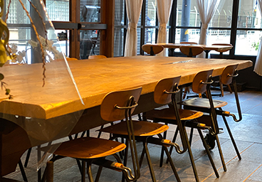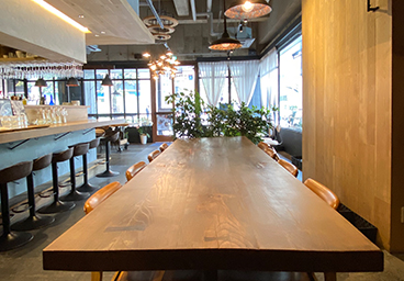 Store Introduction 開放感溢れるオープンキッチンの店内 Table layout 少人数のパーティーから貸切立食パーティーまでニーズに応じたテーブルレイアウトが可能。 別ウィンドウでテーブルレイアウトPDFが開きます